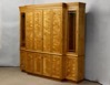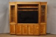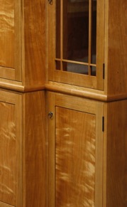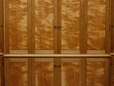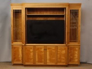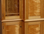This Custom Entertainment Center is made of solid Cherry with solid Curly Cherry Door Panels from the same log for consistent color, grain, and figure. This Entertainment Center is made to go with a custom coffee table and end table we recently completed. This Entertainment Center will have 12 doors total. Both middle upper and lower sections will have bi-fold pocket doors that will slide back into the case. The upper section will house a 50” flat screen TV and the lower section will house all of the electronics. The upper side doors will have glass panels with a cherry detail to match the design of the other pieces this was designed with.