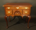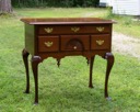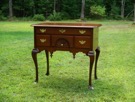 This Queen Anne Lowboy (dressing table) was handmade using the proportions of some of the finest Queen Anne furniture ever built, with graceful curves and a fan carved center drawer. This mahogany dressing table has a book matched top and cabriole legs with pad feet. A hand rubbed french polish finish and reproduction hardware complete this piece. Ht: 31” Wd: 35” Dp: 21”