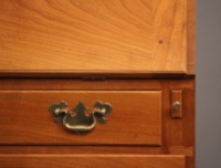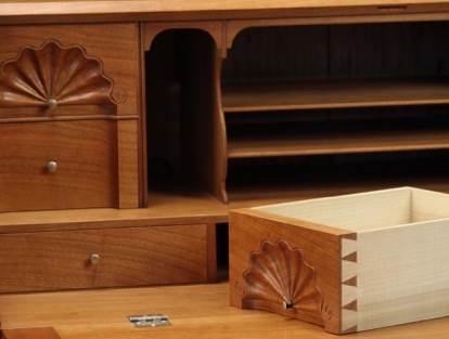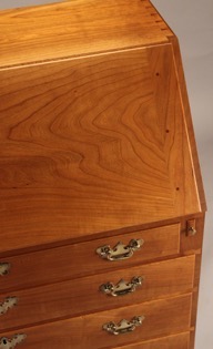 The Slant Front Desk pictured here is handmade of solid premium grade cherry cut from the same log for color and grain uniformity throughout the entire piece. Exterior details are based on a few Chippendale examples made by John Goddard and John Townsend of Newport Rhode Island in the 18th Century. The desk interior is custom designed to function with modern devices while maintaining rich traditional stylings. Block and shell carved drawers made with hand cut dovetails surround the openings designed for a notebook/laptop, ipad and other desk necessities. This desk is made with hand cut dovetail joinery throughout. All drawer are made with hand cut dovetail joinery, interior drawer parts are made of quarter sawn poplar for added stability and a clean uniform look. Drawer bottoms are made of solid polar. Finishing touches on this desk include high quality brass hardware and a beautiful, protective hand rubbed finish. Standard size Ht: 42” Wd: 40” dp: 22”.