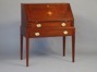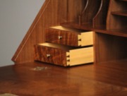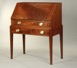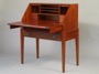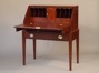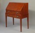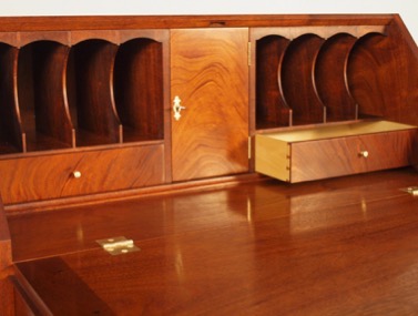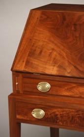 Below are a variety of examples of some of the Slant Top Desk on frame we have made. This custom designed desk has Hepplewhite and Queen Anne design elements. Details include: tapered legs, pinned mortise and tenon joinery, fully hand cut dovetail drawers and case with exposed dovetails on the top and a beautiful protective hand rubbed finish. This desk can be completely custom made with a fully customizable interior to suit your needs, including an interior made for use with modern electronics with the look of a traditional design. This desk looks amazing in a variety of hardwoods including Walnut, Tiger Maple, Mahogany ,Cherry, Birdseye Maple and others. Each desk can be custom finished.