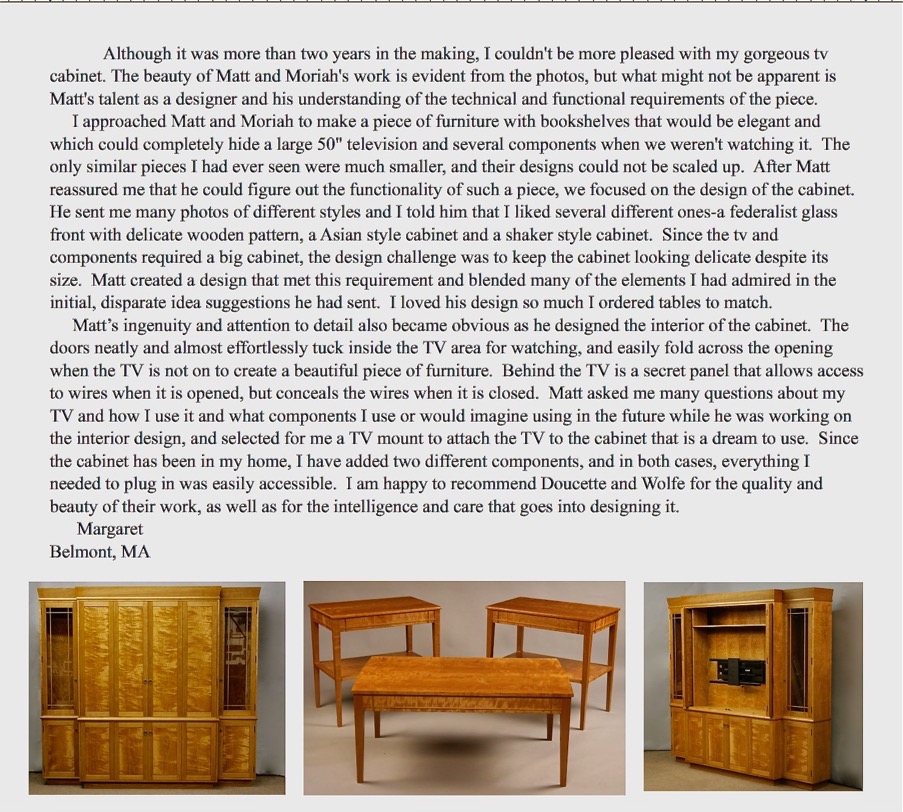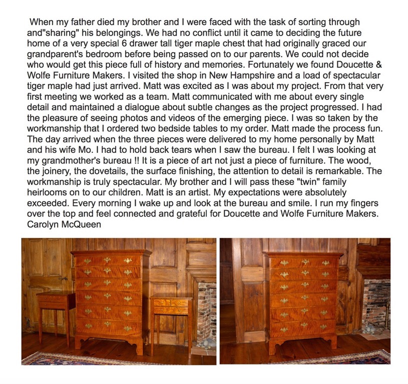 As a custom furniture maker Matthew Wolfe is in a class by himself. And as a team, he and Moriah are delightful, fun, and easy to work with. Matt recently completed this slant top desk commissioned by me for my mother who had just downsized from a large home to a senior living community in the Boston area. Pictures simply cannot portray the quality and attention to detail in this piece. We were simply in awe when it arrived. It is more than just a piece of furniture ... it is a memory. After more than a year on his wait list [he is very much in demand] mom and I drove up to his shop in NH to meet Matt & Moriah in person, see their shop, and inspect some of his current work in progress. From that time forward we participated in the process in a delightful way not anticipated when the desk was commissioned. We worked together on the interior design to come up with something beautiful but functional in this day of computers. Something as inconspicuous as the design for wire handling behind the paper/computer slots was a work of art in itself. Matt emailed us pictures all along the process which kept us involved and engaged. They showed the rough sawn wood arriving, the matching of grains, the building & joinery process, the fine detailed carving, dovetailing, hardware selection, and finishing process, as well as everything else along the way. Notwithstanding all this we were still surprised and amazed at the quality and detail when the piece was delivered. Thank you Matt & Moriah for a great piece and a great experience. – John Cantlin 2015